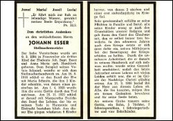 Stellmachermeister; Eltern: Johann Baptist Esser u. Anna Maria geb. Hambloch; ∞ 16.9.1916 Maria Schmitz, † 1.4.1920; 2 K., davon 1 †; ∞ 25.11.1921 Margarethe Derichs; 8 K., davon 2 †; 1 Sohn ist mit 17 J. im 2. Weltkrieg gefallen |