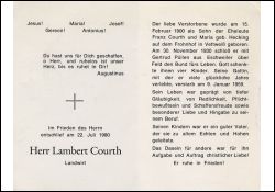 Landwirt; Eltern: Franz Courth u. Maria geb. Hecking; ∞ 30.11.1930 Gertrud Püllen aus Eschweiler, † 9.1.1959; 4 K. |