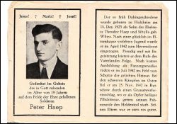 Gefallener 2. Weltkrieg; Eltern: Theodor Haep u. Sibylla geb. Wilms; April 1942 zum Heeresdienst eingezogen; Juli 1942 rückte er ins Feld |