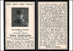 Gefallener 1. Weltkrieg; 4.2.1915 zu den Fahnen gerufen; Mitgl. Jünglingsverein u. Kirchenchor; |