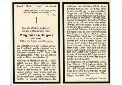 Mitgl. Frauen- u. Mütterverein; längere, schwere Krankheit; ∞ 21.5.1898 Peter Hilgers; 13 K., davon 6 †; 1 Sohn im 2. Weltkrieg vermisst; 2 Söhne im 2. Weltkrieg gefallen; 1 Schwiergesohn vermisst; 1948 Goldhochzeit; |