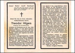 Mitgl. Kirchenchor; Eltern: Franz Wilhelm Hilgers u. Katharina geb. Welter, † 25.12.1934; ∞ 12.1.1907 Margaretha Koenen aus Holzheim; 11 K., davon 3 jugendl. †; 1 Sohn im 2. Weltkrieg gefallen; ∞ 3.4.1937 Katharina Schiefer geb. Schmitz aus Grefrath; schweres Leiden |