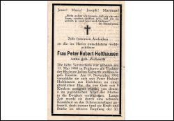 Eltern: Julius Ziebarth u. Emilie geb. Kinitze; ∞ 15.11.1902 Peter Hubert Holthausen aus Holzheim; 9 K., davon 5 jugendlich †; lange schmerzhafte Krankheit; Gehirnschlag |