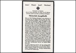 Gefallener 2. Weltkrieg; Eltern: Friedrich Jungbluth u. Margarethe geb. Vogt; ∞ 11.9.1940 Adele Metz aus Neuss-Weckhoven; 2 K.; 26.3.1942 Einberufung; Westfront, 1943 Russland; schwer verwundet; nach Genesung wieder an Ostfront |