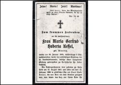 Lungenentzündung; ∞ 12.2.1903 Paul Hubert Kessel; 3 K.; davon das letzte kurz nach Geburt mit ihr gemeinsam ins Grab gesenkt wurde |