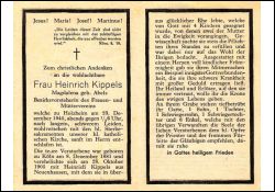 Langes, schweres Leiden; ∞ 28.10.1905 Heinrich Kippels aus Neuenhausen; 4 K., davon 2 †; Bezirksvorsteherin Frauen- u. Mütterverein |