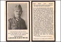 Gefallener 2. Weltkrieg; Eltern: Martin Kremer u. Katharina Abels; ∞ 26.6.1937 Maria Flintz aus Löveling; 14.2.1940 Einberufung; |