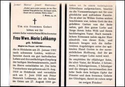 Mitgl. Frauen- u. Mütterverein; schweres Leiden; ∞ 7.6.1938 Peter Heinrich Lohkamp, im 2. Weltkrieg im Osten am 27.8.1944 gefallen; Sohn Willi; |