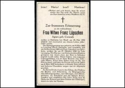 ∞ 14.11.1891 Franz Lüpschen aus Holzheim, † 27.10.1918; 7 K., davon 1 früh †; 1 Sohn Priester (Primiz 8.3.1925) |