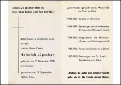 Priesterweihe Köln 5.3.1925; 1925-34 Kaplan in Würselen; 1934-39 Seelsorger der Wandernden Kirche in der Diözese Ermland; 1939-45 Kriegsdienst als Divisionspfarrer u. Gefangenschaft; 1945-62 Pastor an St. Marien in Düren; 1962-63 Seelsorger am St. Josef-Krankenhaus in Prüm |