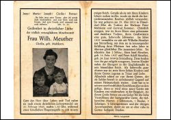 Opfer 2. Weltkrieg; Tod durch Bombenangriff, zusammen mit Mutter und Bruder; Eltern: Wilhelm Meuther u. Cäcilia geb. Malzkorn |
