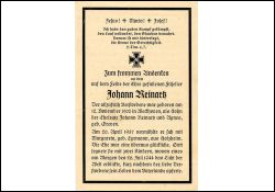 Gefallener 2. Weltkrieg; Eltern: Johann Reinartz u. Agnes geb. Greven; ∞ 20.4.1937 Margareta Lyrmann aus Holzheim; 2 K., das jüngere am Morgen des 26.7.1944 kurz seinem Tod geboren; Einberufung 3.12.1943 |