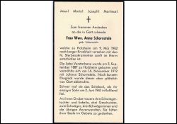 ∞ 16.11.1912 Johann Schornstein, sehr bald †; 1 Sohn, am 2.6.1943 in Russland gefallen (2. Weltkrieg); lange Krankheit |