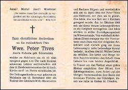 Eltern: Wilhelm Schornstein u. Barbara geb. Hilgers; ∞ 12.4.1912 Peter Tives, † 14.10.1940; 2 K. |