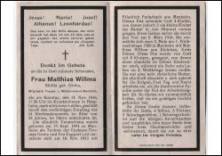 Eltern: Thomas Grohs (Groß) u. Eva geb. Kappert; ∞ 10.11.1913 Friedrich Puderbach aus Manheim, † 5.3.1918; 3 K., davon 2 früh †; ∞ 15.12.1920 in Manheim Matthias Willms aus Kleinhau, Kr. Düren; 8 K., davon 1 früh †, 1 Sohn im 2. Weltkrieg gefallen; |