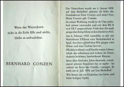 Eltern: Gutsbesitzer Peter Conzen u. Maria geb. Conzen; als Ulan im 1. Weltkrieg schwer verwundet; führte elterl. Hof; ∞ 6.2.1930 Marietheres Zillikens vom Machabäerhof in Spiel; 3 K.; seit 15 J. zunehmend schwere Krankheit |