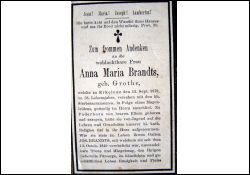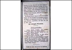 Magenleiden; ∞ 13.10.1849 Josef Brandts; in ihrer langwierigen Krankheit standen ihre beiden Nichten als treue Pflegekinder ihr bei |