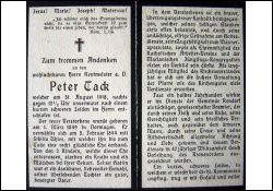 ∞ 3.2.1894 Sibilla Uhles; 3 K., davon 2 b.d. Geburt †; Rentmeister a.D.; Ehrenmitgl. Kath. Arbeiterverein u.d. Marian. Jünglingskongregation: Mitgl. Kirchenvorstand; 47 J. im Dienst der Gemeinde Rondorf; Kronenorden |