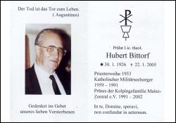 Sohn v. Thea u. Josef Bittorf, Prälat Lic. theol.; Priesterweihe 1953; kath. Militärseelsorge; Präses der Kolpingsfamilie Mainz-Zentrale e.V. 1991-2002; verstorben während eines Kur/Reha-Aufenthaltes; Beerdigung Hauptfriedhof Mainz |