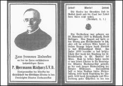 Erst spät Eintritt in das Missionshaus Steyl; 1900 Priesterweihe in St. Gabriel bei Wien; im gleichen Jahr nach USA in junge Niederlassung der Steyler Missionare; Leiter der Missionsdruckerei; 12 J. lang Novizenmeister für die Priestertumskandidaten; starb an Lungenentzündung nach einer Operation; letzte Ölung aus der Hand seines Bruders Pater Prof. Dr. Stephan Richarz, S.V.D., † 1934 in China |