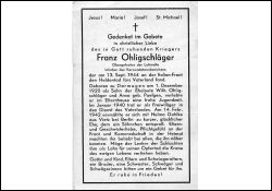 Gefallener 2. Weltkrieg; Eltern: Wilhelm Ohligschläger u. Anna geb. Paefgen; Jan. 1940 als Freiwilliger zur Wehrmacht; ∞ 14.2.1942 Helma Gohlke aus Vietz b. Berlin; 1 Sohn; |