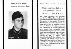 Gefallener 2. Weltkrieg; Eltern: Johann Werres u. Gertrud geb. Humpertz; 1943 zum 1. Mal verwundet (Miusfront); Bauchschuß; Ehrenfriedhof Kamenka (Stommeln) |