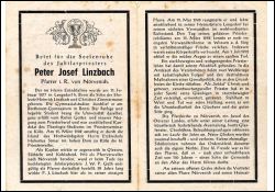 Eltern: Heinrich Linzbach u. Christine geb. Zimmermann; Priesterweihe Köln 15.3.1902; Kaplan in Glessen, Süchteln u. Kohlscheid; 1910 Pfarrverwalter u. n. Tod von Pfr. J.W.P.Guth Pfarrer in Nörvenich; wirkte dort 38 J.; 15.5.1948 Ruhestand; lebte anschließend in Heimatpfarrei Lengsdorf; Ausmalung der Pfarrkirche Nörvenich, bunte Glasfenster |