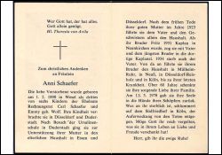 Fräulein; Eltern: Rechnungsrat Carl Schaefer u. Emmy geb. Wolf; Kindheit in Düsseldorf u. Duderstadt; unterstützte Mutter, † 1923, u. führte dem Vater, † 1934, u. Geschwistern den Haushalt in Essen u. Düsseldorf; 1931 mit Bruder Fritz, Kaplan, in Kaplanei n. Neunkirchen; mit Bruder nach Mülheim-Ruhr, Neuss, Düsseldorf-Reisholz u. Köln |