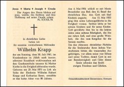 Eltern: Wilhelm Hubert Krapp u. Katharina geb. Esser; ∞ 4.5.1904 Maria Braunleder aus Birk, † 15.5.1933; 5 K. |