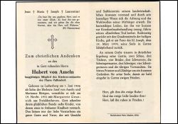 Lngj. Mitgl. Kirchenvorstand Puffendorf; Eltern: Josef von Ameln u. Marianne geb. Büttgen; ∞ 19.11.1931 Margarete Geuenich; 6 K., davon 1 früh †; hartnäckiges Leiden; Druck in Jülich |