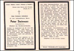 Landwirt; Mitgl. Des Kirchenvorstandes; lange Krankheit; Eltern: Hubert Steinwarz u. Margaretha geb. Schorn; ∞ 11.2.1899 Christine Wachendorf; "arbeitsam ohne Wühlerei", "Dosis freundlichen Humors"; 10 überlebende K. |