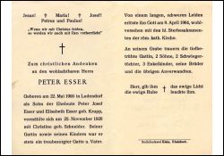 Eltern: Peter Josef Esser u. Elisabeth geb. Krupp; ∞ 25.11.1926 Christine Schneider; langes, schweres Leiden; 2 Söhne |
