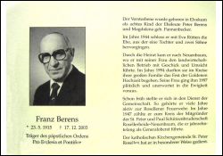 Eltern: Peter Berens u. Magdalena geb. Pannenbecker; ∞ 1944 Eva Rütten, † 1997; 3 K.; Wohnort Neuenbaum; landwirtschaftl. Betrieb; viele Jahre Mitglied der Roseller Feuerwehr; 1947 Mitbegründer der St. Peter u. Paul Schützenbruderschaft Rosellerheide-Neuenbaum; Träger des Ordens Pro Ecclesia et Pontifice; seit 1951 Mitgl. Kirchenvorstand, 1974-86 dessen stellv. Vorsitzender |