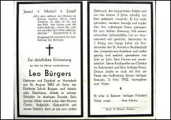 Eltern: Jakob Bürgers u. Maria geb. Deselaers; ledig; gebrechlich seit Geburt; die letzten 3 J. ans Bett gefesselt; lange Jahre Vorsitzender der St. Antonius-Bruderschaft; Druck in Geldern |