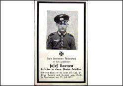 Gefallener 2. Weltkrieg: Eltern: Peter Koenen u. Gertrud geb. Theiß; Einberufung 12.5.1941; 18 Monate ununterbrochen im Kampf gegen den Bolschewismus; Tod b. Bombenangriff; Heldenfriedhof von Murnajewo |