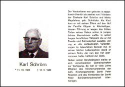 Eltern: Karl Schrörs u. Maria Magdalena geb. Schnitzler; kam mit Eltern auf den Hof der Familie Küpper in Allerheiligen, dessen Führung er nach frühem Tod des Vaters übernahm; Mitgl. Kirchenvorstand St. Peter Rosellen u. Mitgl. D. Vorstandes der St. Peter Schützenbruderschaft Allerheiligen; ∞ 12.5.1937 Elisabeth Schumacher vom Kuckhof; 1 Sohn |