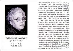 Eltern: Engelbert Schumacher u. Elisabeth geb. Schmitz; ∞ 12.5.1937 Karl Schrörs aus Allerheiligen, † 13.5.1982; 2 K.: Marlene (*8.5.1938), Karl Willi (*7.5.1939, † 24.9.1988); Vors. Kath. Frauengemeinschaft Rosellen; lebte n. Tod des Sohnes b. Familie der Tochter in Rosellerheide |