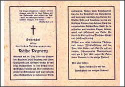 Schmerzvolles Krankenlager; Eltern: Josef Regnery u. Margarete geb. Heinzen; blieb bis zuletzt im Elternhaus; trug Hauptlast des Haushalts |