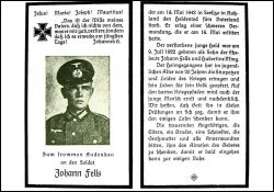 Gefallener 2. Weltkrieg; erlag schwerer Verwundung vom 16.5.1942; Eltern: Johann Fells u. Hubertine geb. Ming; |
