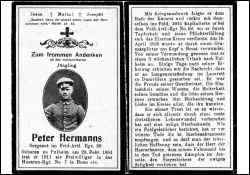 Gefallener 1. Weltkrieg; 1911Freiwilliger in Husarenregiment; 18.4.1918 durch Grnatsplitter verwundet; nach Genesung 3 Wochen Urlaub in Pulheim; einige Tage später Nachricht vom Tod durch Lungenentzündung |