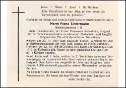 Wohnort: Nettesheim b. Rommerskirchen; Längeres Leiden; Schmiedemeister i.R.; ehem. Brandmeister der Freiw. Feuerwehr Nettesheim; Mitgl. St. Sebastianus-Schützenbruderschaft Nettesheim; Mitgl. Kirchenchor Nettesheim; ∞ 1910 Katharina Neuen, † ; 4 K., davon 1 Sohn im 2. Weltkrieg gefallen († im Lazarett Halle/Saale) |