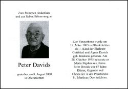 Eltern: Gottfried Davids u. Agnes geb. Küskens; ∞ 28.10.1935 Maria Bigdun aus Herne; 67 Jahre lang Küster, Organist u. Chorleiter an St. Martin in Oberkrüchten |