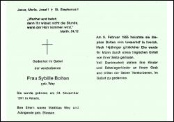 Eltern: Matthias Wey u. Adelgunde geb. Blassen; ∞ 9.2.1955 Stephan Bolten vom Issmerhof in Ilverich, † durch trag. Unfall n. 14 J.; Kinder |