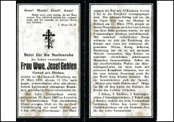 Lange, schmerzhafte Krankheit; ∞ 3.7.1891 Josef Gehlen, † 17.3.1910 in Brüssel; 13 K., davon 5 †; zog allein 8 Kinder groß |