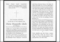 Eltern: Peter Hermann Tillmanns u. Anna Gertrud geb. Bonus; ∞ 12.4.1920 Johann Laurenz Jakobs, † 7.1.1959; 6 K., davon 1 Sohn im 2. Weltkrieg gefallen; |
