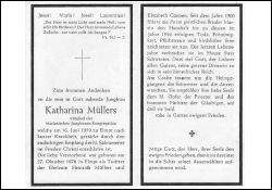 Jungfrau; Mitgl. Jungfrauenkongregation; Eltern: Heinrich Müllers u. Elisabeth geb. Cünnen; seit 1900 führte sie ihrem geistl. Bruder Martin Müllers bis zu dessen Tod 1946 den Haushalt; die letzten Lebensjahre bei ihrer Schwester |