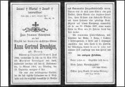 Mitgl. Mütterverein; ∞ 12.5.1874 Mathias Brendges; 3 K., davon 1 Sohn mit 25 J. am 29.10.1901 †; |