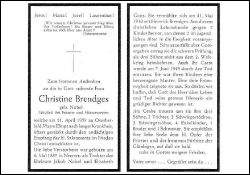 Mitgl. Frauen- u. Mütterverein; lange Krankheit; Eltern: Jakob Nobel u. Elisabeth geb. Conz; ∞ 31.5.1910 Heinrich Brendges, † 7.6.1949; 7 K., davon 2 jugendl. †; 3 Söhne im 2. Weltkrieg gefallen; |