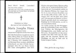 Mitgl. Frauengemeinschaft Elmpt; Eltern: Josef Görtz u. Maria geb. Kunigunde Esser; ∞ 5.10.1935 Hermann Houx; 4 K.; landwirtschaftlicher Betrieb; seit langem schwere Krankheit |