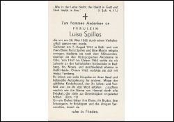 Fräulein; Tod durch Verkehrsunfall; Eltern: Franz Spilles u. Elise geb. Martin; Studium Pädagog. Akademie Köln; 1957-Osten 1962 Lehrerin kath. Volksschule in Budberg, Kr. Moers, anschließend in Brühl-Heide. Ostern 1962 Verlobung mit Heinz Tomberg |